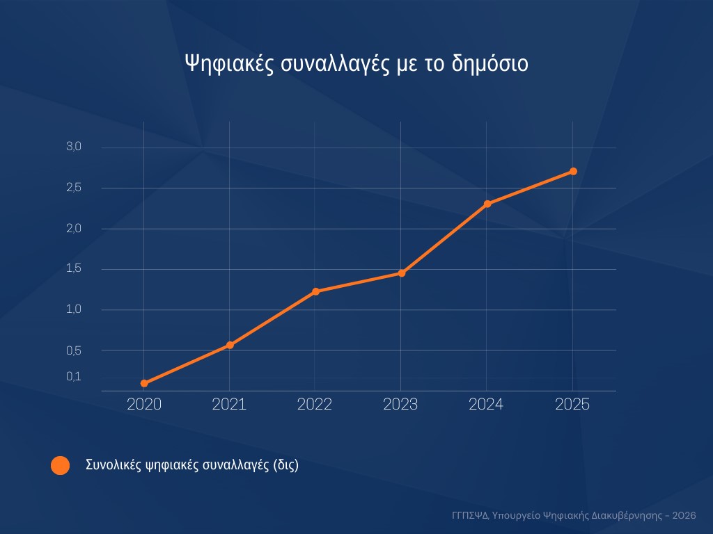 Νέα μεγάλη αύξηση κατά 86% σε σχέση με το 2023 και κατά 17% σε σχέση με το 2024 κατέγραψαν οι ψηφιακές συναλλαγές των πολιτών με το Δημόσιο για το 2025, σύμφωνα και με τη στόχευση του Υπουργού Ψηφιακής Διακυβέρνησης και Τεχνητής Νοημοσύνης, Δημήτρη Παπαστεργίου.